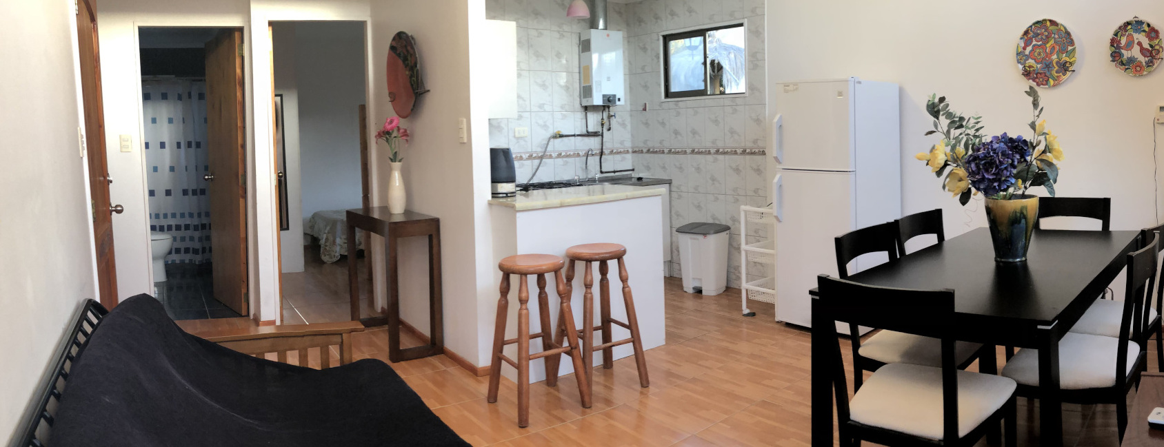 Espacio principal de la cabaña que posee la iluminación y la decoración para que su estadía sea mas acogedora. Se incluye un futón cama y el comedor.